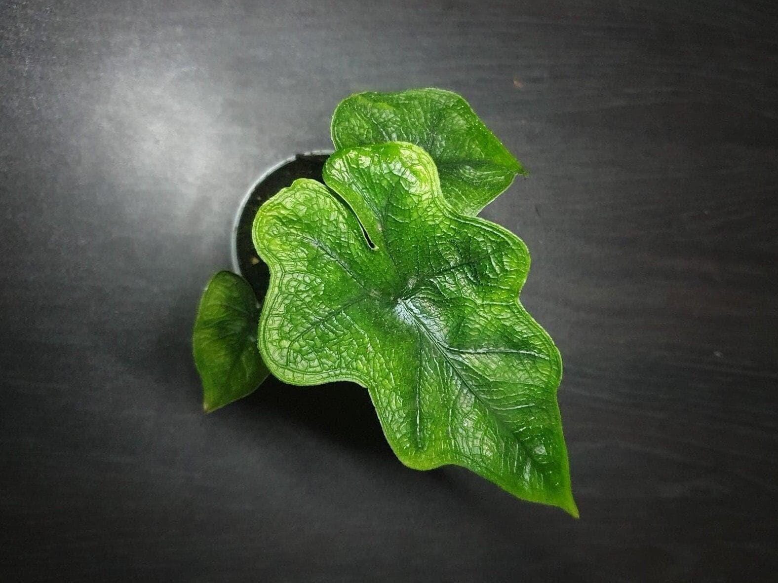 Alocasia sp. 'Jacklyn' is a stunning tropical plant renowned for its dramatic and intricate foliage. This member of the Araceae family captivates with its large, arrow-shaped leaves that exhibit a vibrant green hue and striking, prominent veins. The leaves are textured and slightly corrugated, adding to their visual appeal and giving them a somewhat sculptural quality.'Jacklyn' has a distinctive growth habit with upright, elongated stems that support the impressive foliage. Each leaf can grow quite large, contributing to the plant's bold and exotic appearance. The veins are often a darker green or even black, creating a striking contrast against the lighter green leaf surface.This Alocasia thrives in bright, indirect light and prefers a well-draining, airy soil mix. It should be kept consistently moist but not waterlogged, as it is sensitive to overwatering. High humidity levels are beneficial for 'Jacklyn', making it well-suited for environments such as bathrooms or close to a humidifier.Overall, Alocasia sp. 'Jacklyn' is a remarkable plant that adds a touch of the tropics to any indoor space. Its unique and dramatic foliage makes it a standout piece in any plant collection, appealing to both novice and experienced plant enthusiasts.6cm pot
