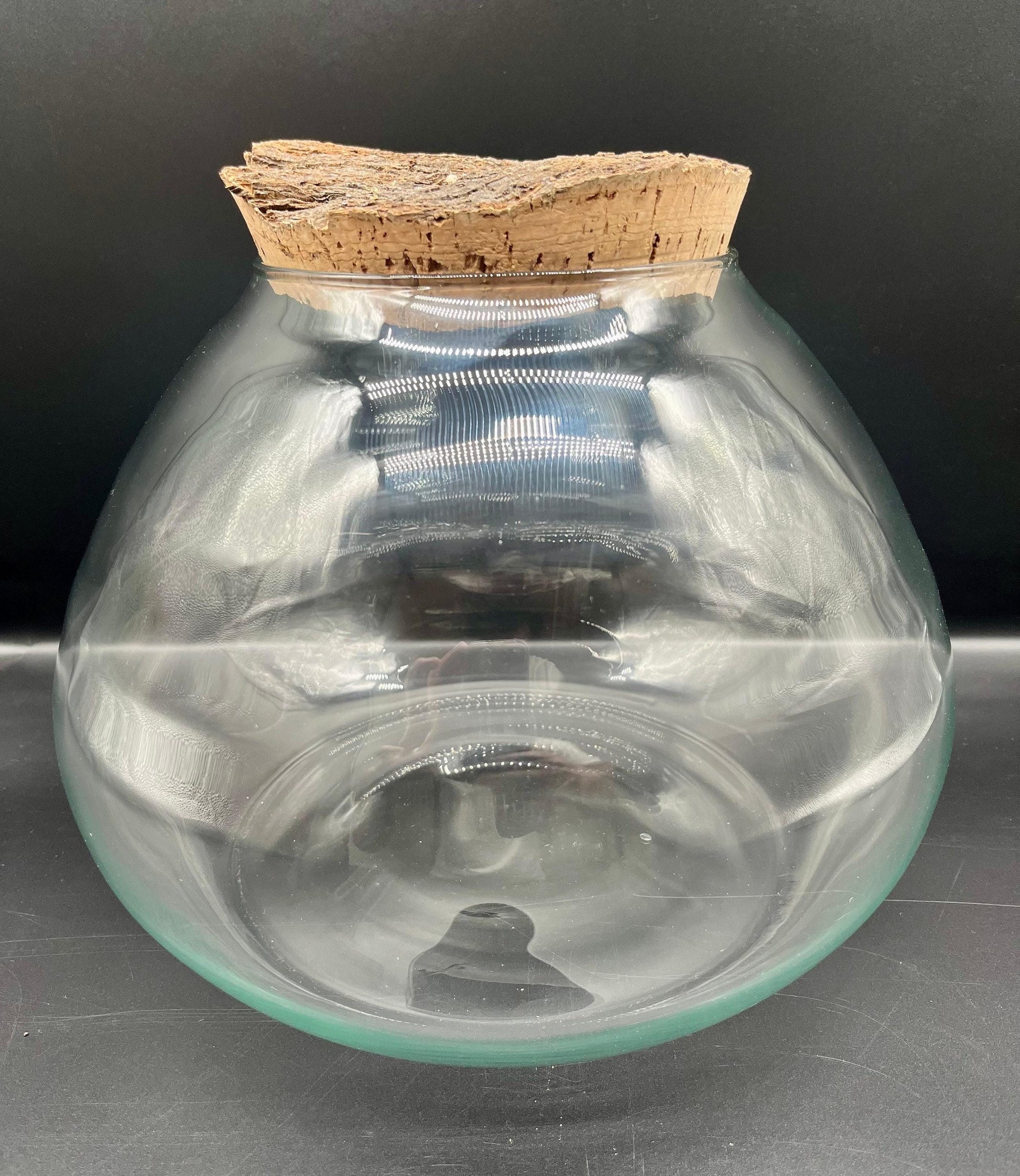 A beautiful high quality glass ball terrarium with a rustic and unique bark top cork lid!