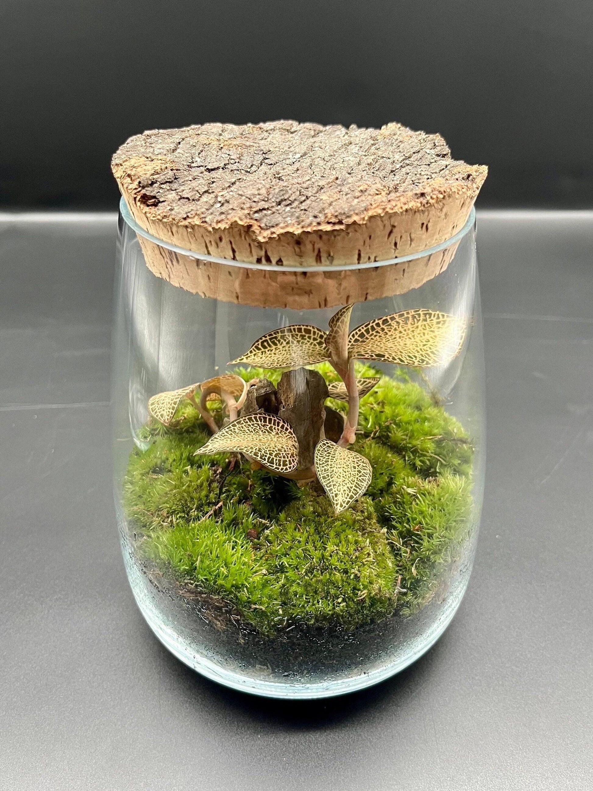A beautiful high quality glass terrarium with a rustic and unique bark top cork lid!Glass:145mm x 175mmCork:Top diameter approx: 114mmBottom diameter approx: 101mmThickness approx: 30mm to 35mmDue to the nature of these items being cut from natural cork bark some variation can occur.Planted jewel orchid terrarium for examples purposes only.Thank you for shopping with us!